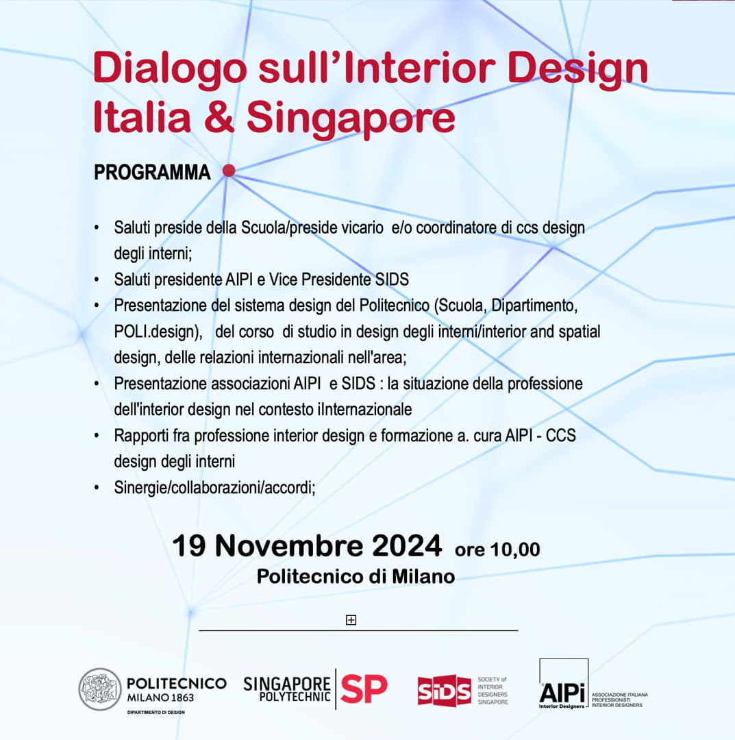 AIPI, insieme al POLITECNICO di MILANO Dipartimento di design e’lieta di ospitare il Prof.Fann Zhi Jie della Singapore Polytechnic , primovicepresidente della Society of Interior Designers di Singapore ecopresidente del Singapore Interior Design Accreditation Council perdialogare di interior design.